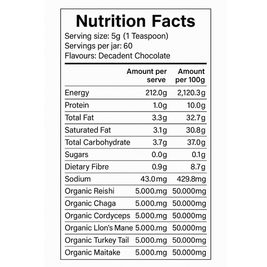 Coconut Milk Powder, Dutch Cocoa Powder, Raw Cacao Powder, Organic Reishi, Organic Chaga, Organic Cordyceps, Organic Lion’s Mane, Organic Turkey Tail, Organic Maitake, Organic Stevia Leaf, Katemfe Fruit, Australian Pink Lake Salt.